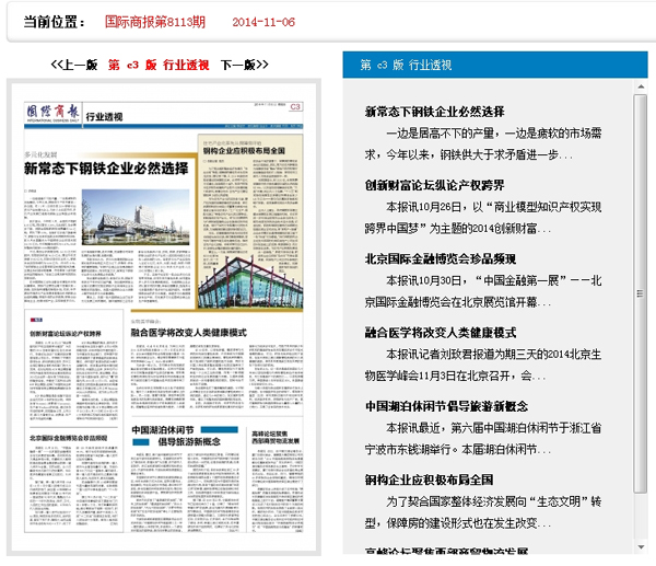 2014年11月6日,《國際商報》第C3版《行業(yè)透視》報道:《鋼構(gòu)企業(yè)應(yīng)積極布局全國》。