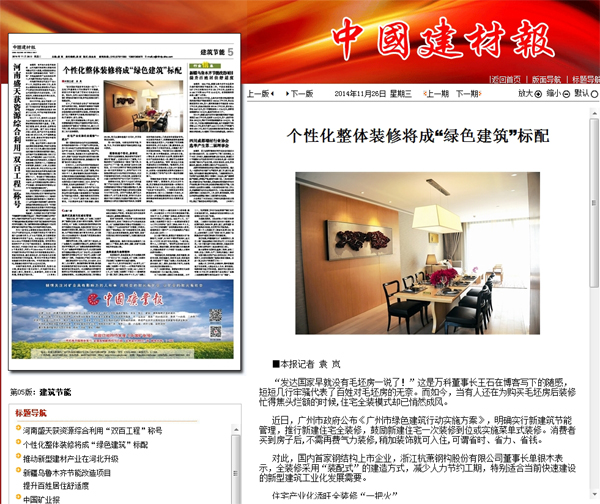 2014年11月26日,《中國建材報(bào)》第05版《建筑節(jié)能》報(bào)道:《個(gè)性化整體裝修將成“綠色建筑”標(biāo)配》。