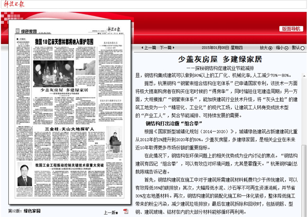 2015年1月8日,《科技日報(bào)》第12版《綠色家園》報(bào)道:《少蓋灰房屋 多建綠家居——探秘鋼結(jié)構(gòu)促建筑業(yè)節(jié)能減排》。
