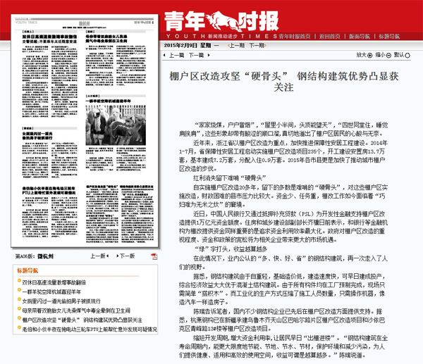 2015年2月9日,《青年時報》第06版《微杭州》報道:《棚戶區(qū)改造攻堅“硬骨頭” 鋼結構建筑優(yōu)勢凸顯獲關注》。