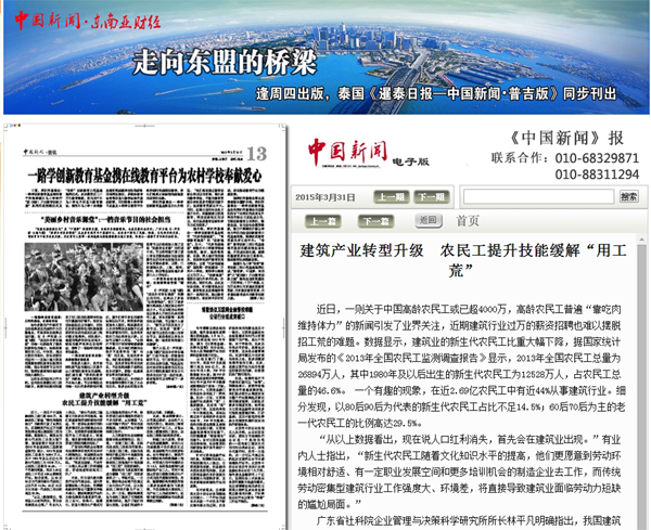 2015年3月31日,《中國(guó)新聞》報(bào)第13版《資訊》報(bào)道:《建筑產(chǎn)業(yè)轉(zhuǎn)型升級(jí) 農(nóng)民工提升技能緩解“用工荒”》。