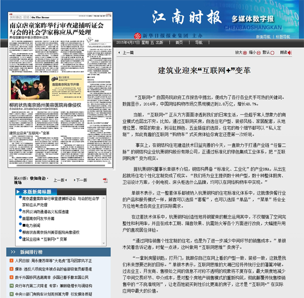 2015年4月17日,《江南時(shí)報(bào)》第A10版《快知身邊·現(xiàn)場(chǎng)》報(bào)道:《建筑業(yè)迎來“互聯(lián)網(wǎng)+”變革》。