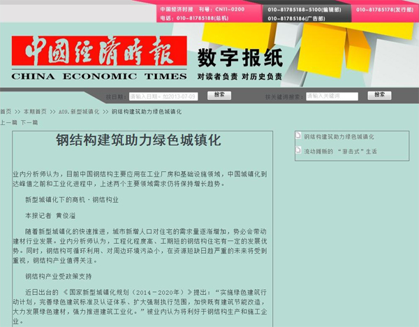 2014年4月7日,《中國(guó)經(jīng)濟(jì)時(shí)報(bào)》A09版《新型城鎮(zhèn)化》周刊頭條以杭蕭鋼構(gòu)為例,報(bào)道:《鋼結(jié)構(gòu)建筑助力綠色城鎮(zhèn)化》。