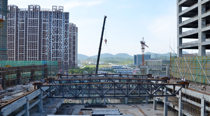 ??? On 30th May, a combination of trusses of 100 tons was successfully slipped at high altitude of Qingshan Lake construction site, which is being constructed by Zhejiang HangXiao Steel Structure Co., Ltd.. This combination of truss is used for a banquet hall in hotel podium at A1 area of Yuexiu Urban Complex (phase 1) in Qingshan Lake Science & Technology Park.