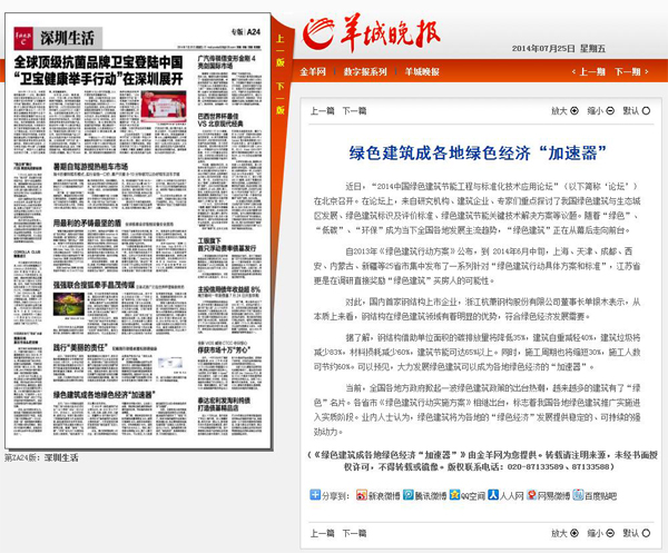 2014年7月25日,《羊城晚報(bào)》A24版《深圳生活》報(bào)道:《綠色建筑成各地循環(huán)經(jīng)濟(jì)加速器》。