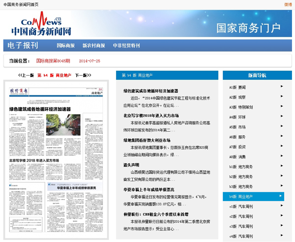 2014年7月24日,《國(guó)際商報(bào)》B4版《商業(yè)地產(chǎn)》報(bào)道:《綠色建筑成各地循環(huán)經(jīng)濟(jì)加速器》。
