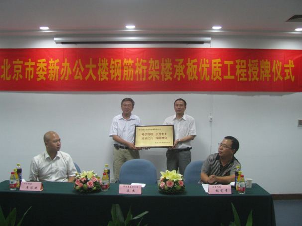 ??? 北京市委基建辦主任巫杰在致辭上說到:在貴公司王愛民副總裁、史志強(qiáng)總經(jīng)理等管理團(tuán)隊(duì)帶領(lǐng)下,漢德邦的桁架樓承板產(chǎn)品獲得了市委、北京城建、監(jiān)理等各方面一致認(rèn)可,贏得了我們高度信任,產(chǎn)品無任何瑕疵,每車產(chǎn)品的到場、轉(zhuǎn)運(yùn)、撤離時(shí)間都嚴(yán)格按照要求進(jìn)行,做到了零失誤,負(fù)責(zé)任的保障整體工程按照計(jì)劃要求順利完工。真正做到了:科學(xué)管理、信譽(yù)至上、質(zhì)量優(yōu)良、保障到位。