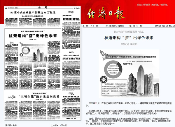 2014年7月29日,《經(jīng)濟(jì)日?qǐng)?bào)》第12版《公司》報(bào)道:《杭蕭鋼構(gòu)“搭”出綠色未來》。