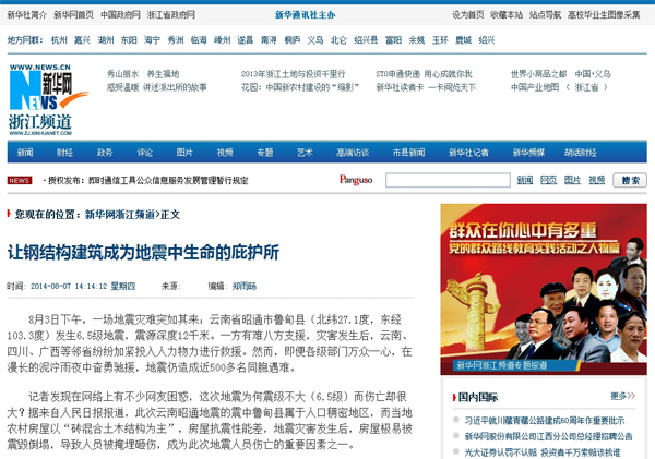 2014年8月7日,《新華網(wǎng)浙江頻道》報道:《讓鋼結構建筑成為地震中生命的庇護所》