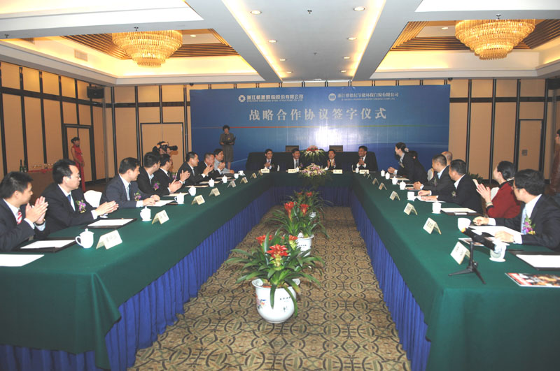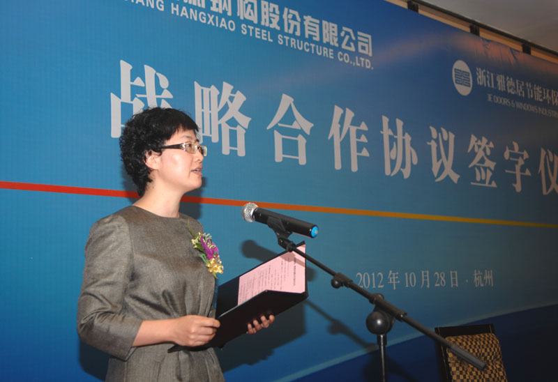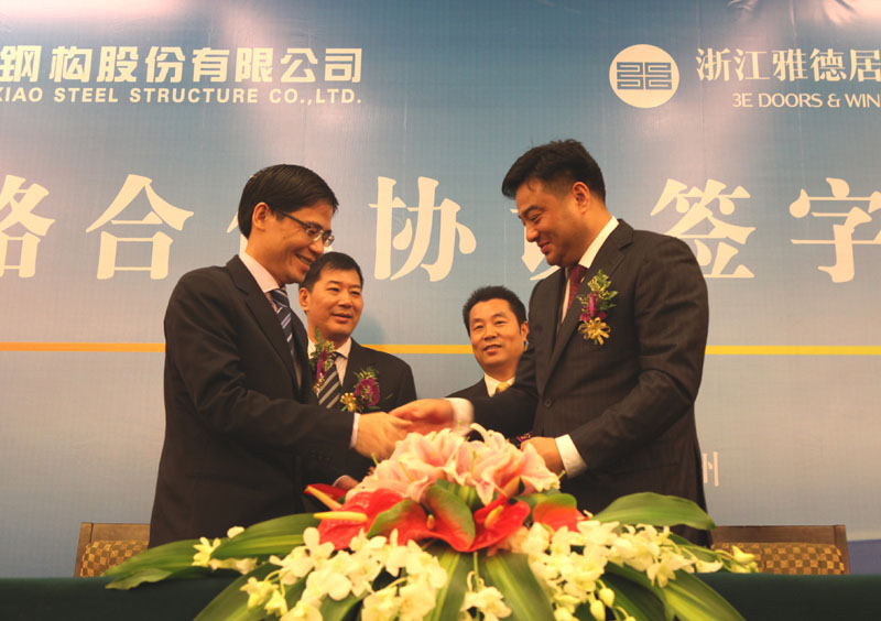 ??????? 10月28日,浙江杭蕭鋼構股份有限公司與浙江雅德居節(jié)能環(huán)保門窗有限公司簽署戰(zhàn)略合作協(xié)議現(xiàn)場。