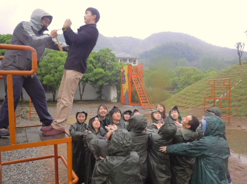 ??? 4月20日,在室外溫度低于10度且下著大雨的早晨六點半,我們35人無一人落單,大家充滿期待坐上前往拓展基地的車,一路上大家還略有睡意,到基地已是八點十分。本次拓展精心為未參加過拓展的員工挑選了三個體驗項目,分別是背摔、高空斷橋、七巧板,以小組的形式依次體驗。