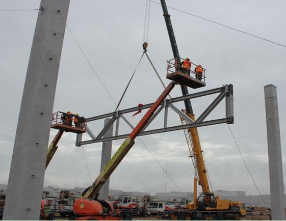 ??? 7月2日上午9點(diǎn)18分,華晨寶馬汽車三期廠房工程順利完成首根桁架的吊裝,標(biāo)志著由浙江杭蕭鋼構(gòu)股份有限公司(以下簡稱杭蕭鋼構(gòu))制作、安裝的該項(xiàng)目開始進(jìn)入地上鋼結(jié)構(gòu)施工階段。該工程預(yù)計(jì)2013年9月底完成主體結(jié)構(gòu)施工。華晨寶馬汽車總經(jīng)理、副總經(jīng)理、華晨寶馬汽車項(xiàng)目經(jīng)理、中八局大連公司總經(jīng)理、彪馬管理公司經(jīng)理、監(jiān)理總監(jiān)及我司工程系統(tǒng)王(生宏)總監(jiān)、營銷系統(tǒng)毛(建輝)經(jīng)理、質(zhì)管部徐(兵)經(jīng)理參加了本次首吊儀式。杭蕭鋼構(gòu)工程系統(tǒng)總監(jiān)王生宏致辭并承諾嚴(yán)格按照甲方、總包、管理公司及監(jiān)理單位要求安全文明施工,確保工程安全、質(zhì)量和工期。杭蕭鋼構(gòu)項(xiàng)目部項(xiàng)目經(jīng)理葉建國代表現(xiàn)場所有管理人員進(jìn)行宣誓保證在整個(gè)項(xiàng)目施工中按照施工組織設(shè)計(jì)、各個(gè)方案交底施工,圓滿的把整個(gè)項(xiàng)目交付給業(yè)主。寶馬汽車公司及中八局對我司給予高度信任及肯定,相信會(huì)很愉快的把這個(gè)項(xiàng)目做好。在公司指導(dǎo)及大力支持下,整個(gè)項(xiàng)目部團(tuán)隊(duì)將密切協(xié)作帶領(lǐng)現(xiàn)場施工人員一起努力共同戰(zhàn)斗定會(huì)取得一個(gè)圓滿結(jié)果。