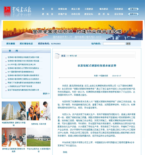 2014年2月17日,《中國建設(shè)報》報道:《杭蕭裝配式鋼筋桁架樓承板獲贊》