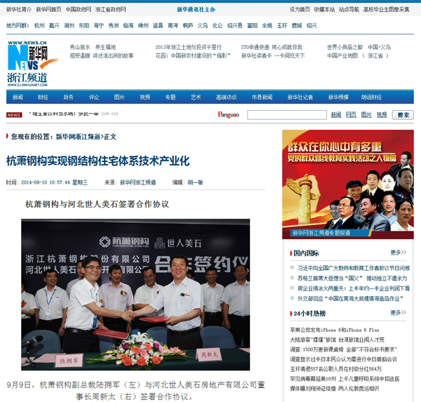 2014年9月10日,《新華網(wǎng)浙江頻道》報道:《杭蕭鋼構(gòu)實現(xiàn)鋼結(jié)構(gòu)住宅體系技術(shù)產(chǎn)業(yè)化 杭蕭鋼構(gòu)與河北世人美石簽署合作協(xié)議》。