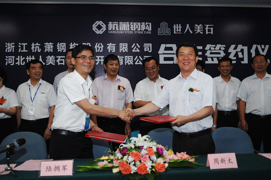 9月9日,浙江杭蕭鋼構(gòu)股份有限公司(簡稱“杭蕭鋼構(gòu)”)與河北世人美石房地產(chǎn)開發(fā)有限公司(簡稱“世人美石公司”)鋼結(jié)構(gòu)住宅體系(含鋼管束住宅組合結(jié)構(gòu))合作協(xié)議簽約儀式在杭蕭鋼構(gòu)總部瑞豐國際商務(wù)大廈舉行。杭蕭鋼構(gòu)董事長單銀木、世人美石公司董事長周新太、河北省邯鄲市涉縣縣委書記李書生、副縣長路正陽等領(lǐng)導(dǎo)參加了簽約儀式。