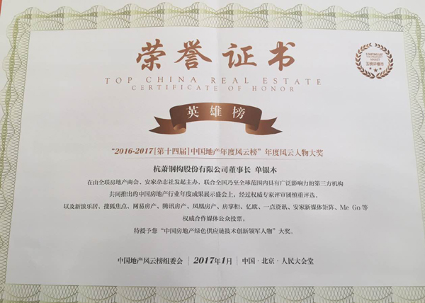 杭蕭鋼構(gòu)董事長(zhǎng)單銀木獲獎(jiǎng)證書